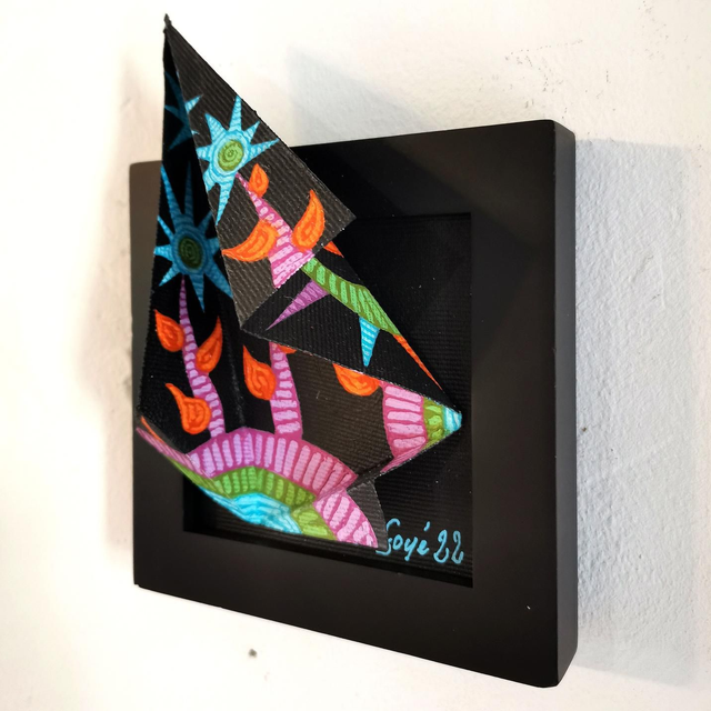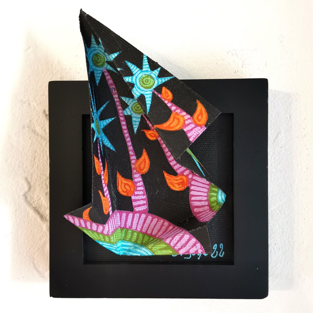 Peinture acrylique et huile sur toile recto verso qui a été pliée et montée dans un cadre.